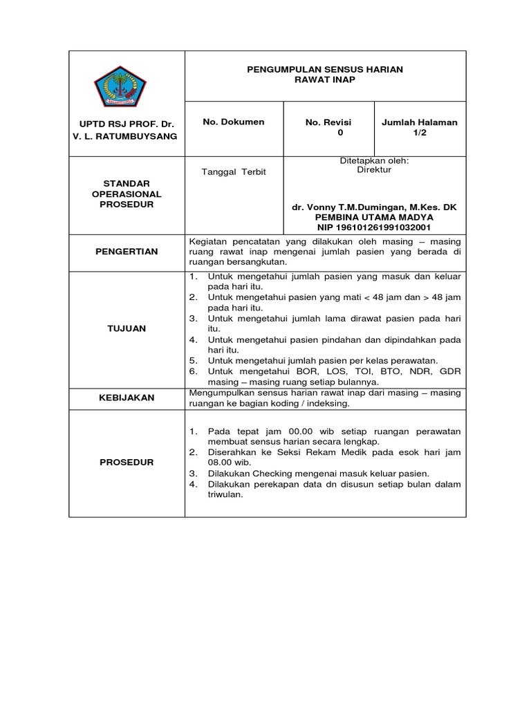 Meneliti/ memeriksa pengisian daftar permintaan makanan pasien berdasarkan macam dan jenis Membuat lapoan harian mengenai pelaksanaan asuhan keperawatan serta kegiatan lainnya di ruang rawat, disampaikan kepada atasan. Tinjauan Keakuratan Data pada Sensus Harian Rawat Inap Di Rumah Sakit Khusus Bedah Banjarmasin Siaga. Format Sensus Harian Rawat Inap Rekam MedisFull description.
