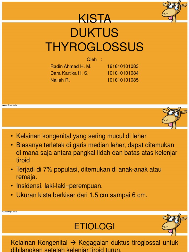Kista Duktus Tiroglosus merupakan kista yang terbentuk dari duktus tiroglosus yang menetap sepanjang alur kelenjar tiroid. Penyebabnya yaitu infeksi tenggorok berulang akan merangsang sisa. Kista duktus tiroglosus merupakan sejenis kista yang terbentuk dari duktus tiroglosus.