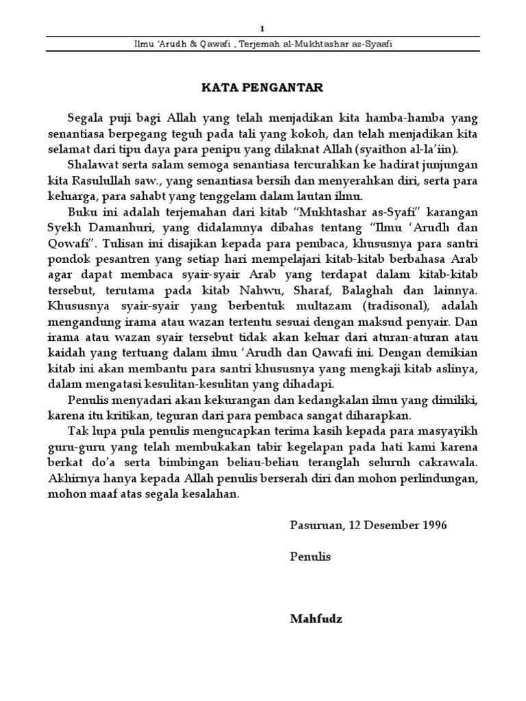 Arudh and Qawafi are knowledge which concern on investigating the rhythm of poem in order to know the Bahr (kind of rhythm), the Qafiah letter, and the harakat (Arabic punctuation) of the poem. Salah satu Ilmu tata bahasa dan sastra arab yang mungkin kurang begitu populer bahkan di kalangan para santrinya sekalipun , meski kita sering menjumpai syi'ir - syi'ir bertebaran di kebanyakan kitab. Semoga bermanfaat untuk para pembelajar Ilmu Arudh, peminat syair Arab (khususnya syair 'amudi), serta yang ingin belajar membuat syair Arab sesuai konvensinya..