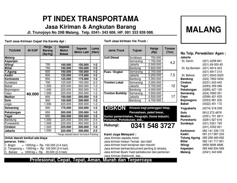 Price List Index Transportama Perwakilan Malang