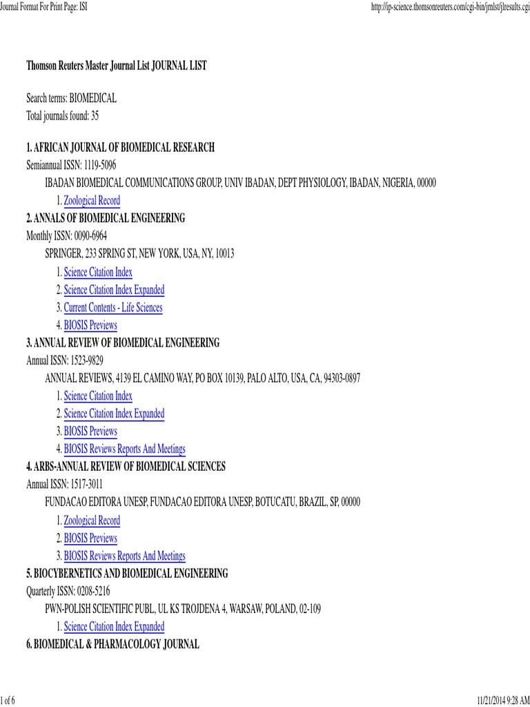 Thomson Reuters Master List of indexed journals or the list of journals in the current year's release of JCR would include it. des Medienkonzerns Thomson.